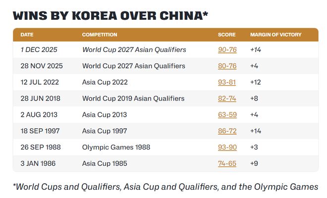 14分是近年來韓國(guó)隊(duì)贏中國(guó)男籃的最大分差/圖片來源:FIBA官網(wǎng)