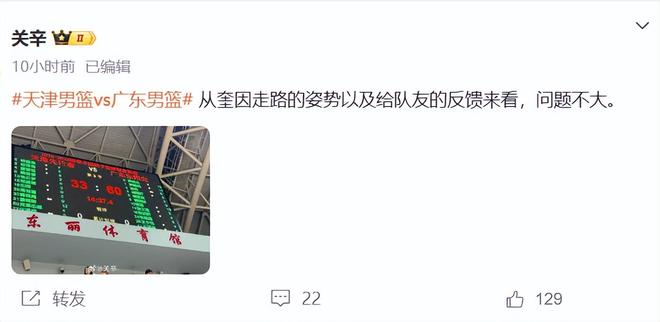 賽后,關(guān)師傅在直播間也向廣東球迷們透露,據(jù)他目前了解,奎因的傷病問(wèn)題不大,奎因自我感覺(jué)還可以,但為了保險(xiǎn)起見(jiàn),他還是得去醫(yī)院拍個(gè)片子。