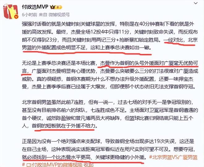 說到外援名記付政浩更是一針見血,怒批北京隊(duì),他表示,一經(jīng)對比,北京男籃的外援配置成色明顯不足,這和上賽季總決賽如出一轍。他明確指出,首鋼的短板就在于外援不給力。他對北京隊(duì)的休賽期的操作感到不解,“CBA已經(jīng)連續(xù)兩個(gè)賽季施行外援四節(jié)七人次了,外援的重要性無須再贅言,我就沒明白,為什么不要預(yù)算花在找靠譜的外援身上呢。就現(xiàn)在CBA這些本土球員,哪個(gè)能打出外援水準(zhǔn)呢?看不懂”付政浩不但幫北京隊(duì)把脈,還給北京隊(duì)提出了解決問題的辦法,他指出,想要奪冠,就必須找到一個(gè)比杰曼水平更高、關(guān)鍵球更穩(wěn)健的小外援。