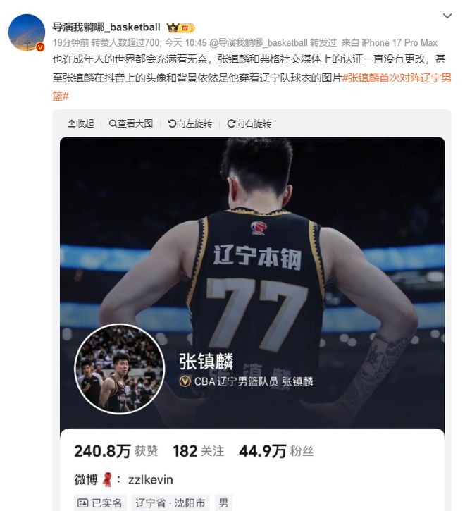 遼寧媒體人導(dǎo)演曬出張鎮(zhèn)麟社媒的注冊信息,張鎮(zhèn)麟一直都沒有更改認證,甚至在DY的頭像、背景都還是遼寧男籃的球衣。
