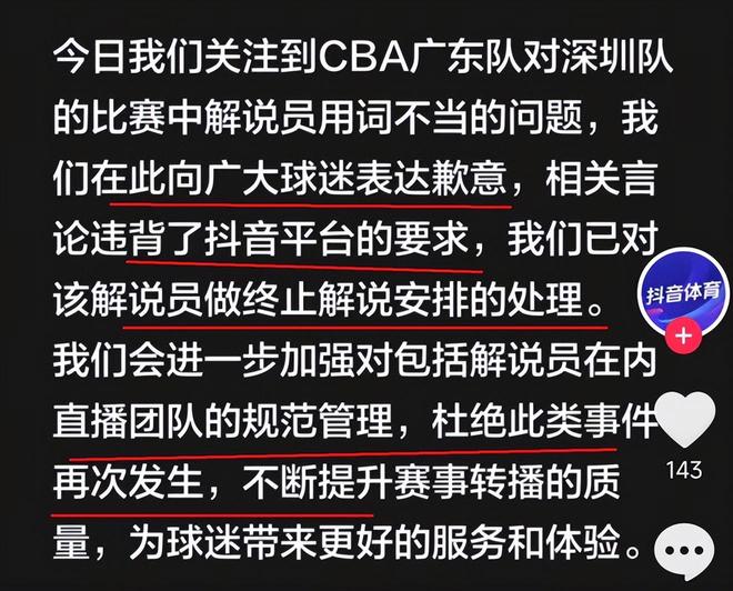 裁判專家丁佳寧更是怒斥:抖音CBA解說出事是早晚的事兒,一點也不意外。他還說,我前幾年說CBA現(xiàn)場像菜市場,沒想到如今CBA把直播也搬到了菜市場。大家都知道,菜市場是什么樣子,那就是亂哄哄的樣子。抖音獲得CBA直播權后,讓一些不三不四的主播帶貨直播,他們中有一些人根本沒有專業(yè)知識,對體育知識了解不多,解說和表達能力極差,甚至說出一些不當的話。因此,球迷呼吁抖音CBA平臺應該進行整頓,嚴格把關和審核,有直播資格的人才能擔任解說,不能再讓阿貓阿狗來擔任解說員了。