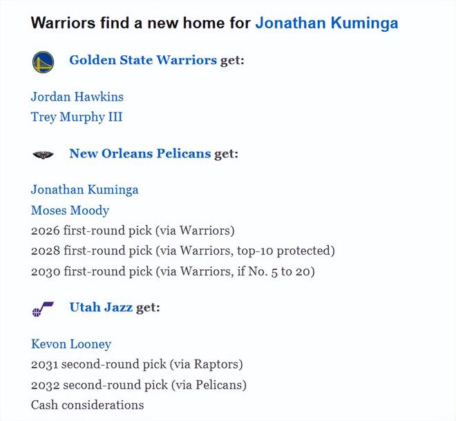 鵜鶘隊(duì)得到:庫明加、穆迪、2026年首輪簽(來自勇士的無保護(hù))、2028年首輪簽(來自勇士,前10順位保護(hù))、2030年首輪簽(來自勇士,順位為5至20位時(shí)生效)