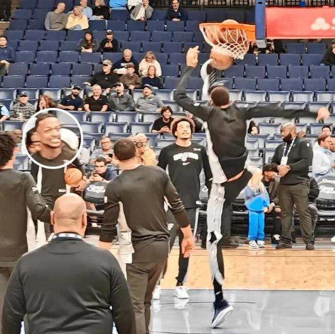 有意思的是根據(jù)美國(guó)媒體NBA Memes曬出的另個(gè)角度照片,看得出文班亞馬一只腳還沒(méi)有離地,他就能踢到籃網(wǎng),畫面真的很很離譜。