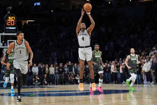 進(jìn)入第四節(jié)比賽,馬刺維持85-76領(lǐng)先,并在之后維持91-82領(lǐng)先,文班亞馬一度三分出手后踩到戈貝爾腳上摔倒,戈貝爾被吹罰賽季第6次惡意犯規(guī)將禁賽一場。戈貝爾之后還肘擊文班亞馬,森林狼在愛德華茲引領(lǐng)下多點開花,一波18-7攻勢反超2分。巴恩斯三分反超1分,麥克丹尼爾斯中投命中,??怂怪型秺Z回領(lǐng)先,愛德華茲拋射再度反超1分。文班亞馬投籃不中,馬刺搶到籃板,??怂谷植恢?,最終馬刺被森林狼19分逆轉(zhuǎn)擊敗。