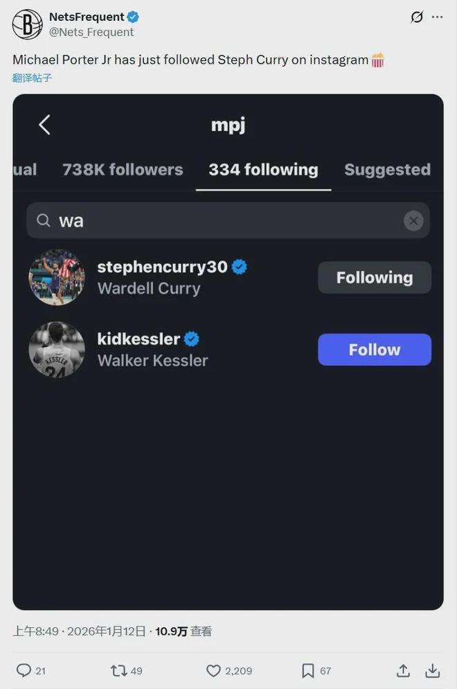 小波特已經(jīng)在個(gè)人社媒上關(guān)注了庫里......