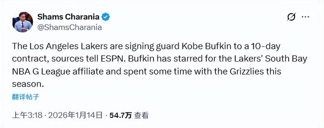 北京時間1月14日,據(jù)名記Shams報道,湖人已同意與后衛(wèi)科比-巴夫金簽下一份10天短合同。巴夫金是2023年NBA選秀的首輪15號秀,職業(yè)生涯前兩個賽季效力于老鷹,休賽期被交易至籃網(wǎng),隨后在2025-26賽季常規(guī)賽開打前被籃網(wǎng)方面裁掉。