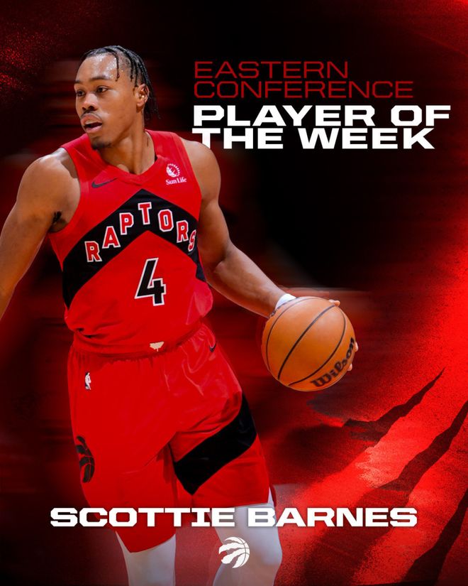 猛龍隊(duì)上周同樣打出3勝1負(fù)的表現(xiàn),巴恩斯場(chǎng)均得到22分、6.3個(gè)籃板和6.0次助攻,他出戰(zhàn)了其中獲勝的3場(chǎng)比賽。