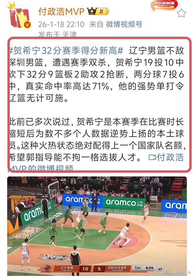 賽后,著名媒體人付政浩發(fā)文,對賀西寧的表現(xiàn)大加贊揚“遼寧男籃不敵深圳男籃,遭遇賽季雙殺,賀希寧19投10中砍下32分9籃板2助攻2搶斷,兩分球7投6中,真實命中率高達71%,他的強勢單打令遼籃無計可施。此前已多次說過,賀希寧是本賽季在比賽時長縮短后為數(shù)不多個人數(shù)據(jù)逆勢上揚的本土球員。這種火熱狀態(tài)絕對配得上一個國家隊名額,希望郭指導(dǎo)能不拘一格選拔人才。"。