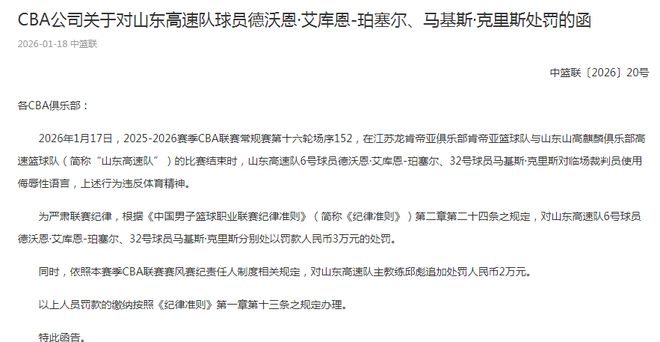 2026年1月17日,2025-2026賽季CBA聯(lián)賽常規(guī)賽第十六輪場(chǎng)序152,在江蘇龍肯帝亞俱樂部肯帝亞籃球隊(duì)與山東山高麒麟俱樂部高速籃球隊(duì)(簡(jiǎn)稱“山東高速隊(duì)”)的比賽結(jié)束時(shí),山東高速隊(duì)6號(hào)球員德沃恩·艾庫恩-珀塞爾、32號(hào)球員馬基斯·克里斯對(duì)臨場(chǎng)裁判員使用侮辱性語言,上述行為違反體育精神。