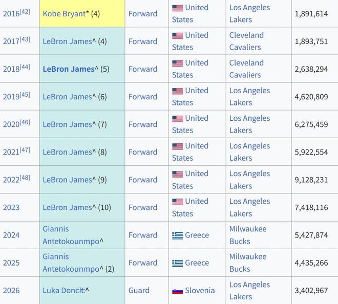 值得一提的是,在此前10年的全明星票選中,東契奇的隊友詹姆斯7次奪得票王,此外字母哥2次奪魁,科比則在退役賽季奪得票王。