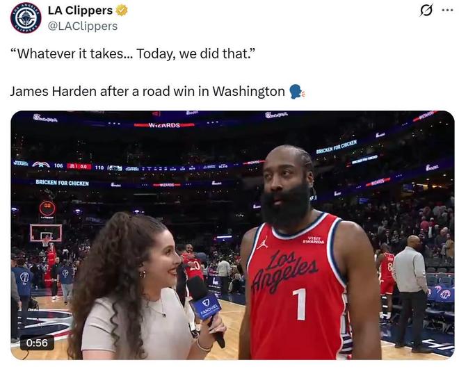 在這種情況下,快船隊本場外線又失準,好在35歲哈登夢回巔峰,最終率隊以110-106有驚無險擊敗奇才拿下6連勝。