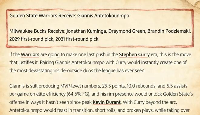 美媒《Fadeaway World》撰文建議,勇士可以打包將庫明加、格林、波杰姆斯基、2029年以及2031年的首輪簽送到雄鹿,換回這位兩屆常規(guī)賽MVP。