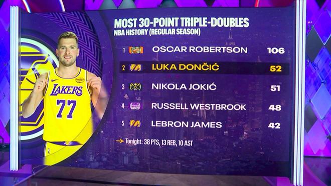 這是東契奇生涯第52次單場交出30+三雙表現(xiàn),成功超越約基奇升至NBA歷史第二,僅次于大O的106次。