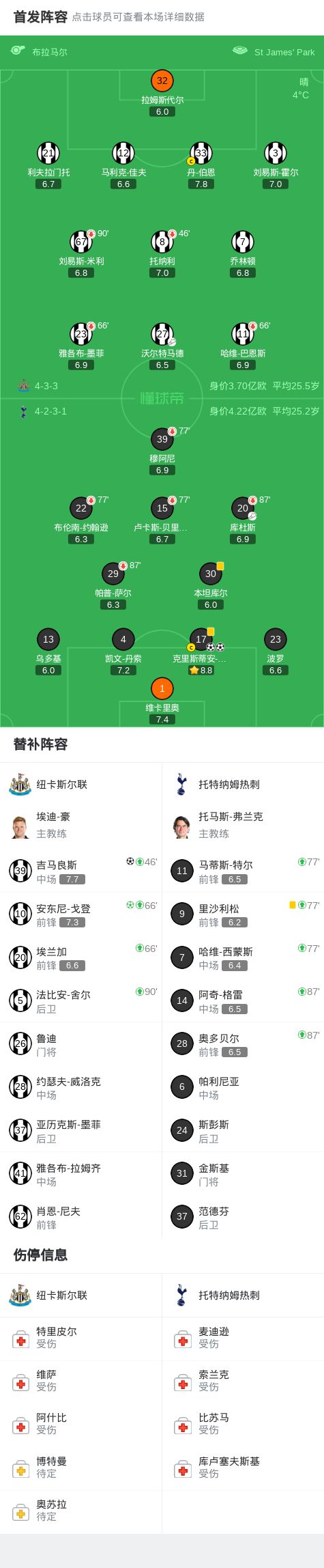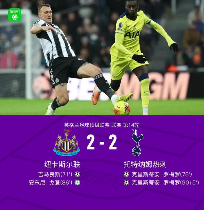 北京時(shí)間12月3日英格蘭足球頂級(jí)聯(lián)賽 聯(lián)賽 第14輪,紐卡斯?fàn)柭?lián)主場對(duì)陣托特納姆熱刺。紐卡斯?fàn)柭?lián)吉馬良斯破門,安東尼-戈登破門。托特納姆熱刺克里斯蒂安-羅梅羅梅開二度。最終比分紐卡斯?fàn)柭?lián) 2-2 熱刺。