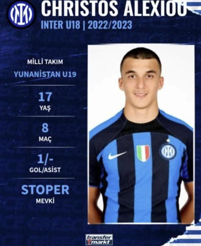 亞歷克西烏(Christos Alexiou),20歲,身高186,希臘籍,2005年6月30日出生希臘首府雅典。目前主要效力于國際米蘭U23司職主力左中衛(wèi),號碼為5號;同時也是希臘U21的主力左中衛(wèi)。