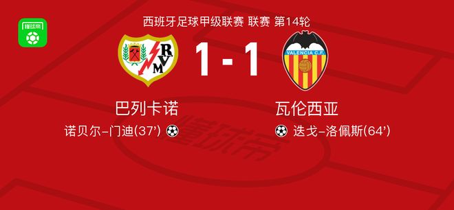 北京時(shí)間12月2日,西班牙足球甲級聯(lián)賽第14輪展開較量,巴列卡諾坐鎮(zhèn)主場迎戰(zhàn)瓦倫西亞。比賽中,貢巴烏送出精準(zhǔn)助攻,幫助諾貝爾-門迪破門得分,為主隊(duì)取得領(lǐng)先。此后瓦倫西亞展開反擊,迭戈-洛佩斯成功攻破對手球門,將比分扳平。雙方均未能再度改寫比分,最終以1比1握手言和。