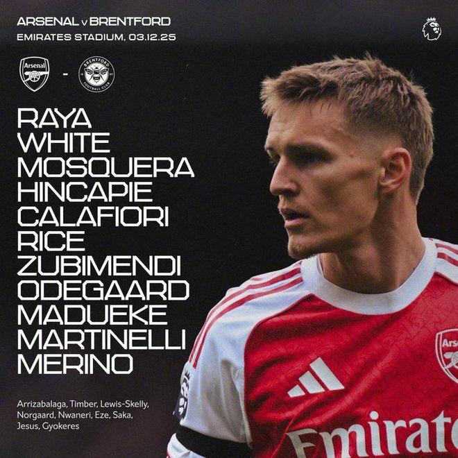 本場(chǎng)比賽,阿森納在首發(fā)上派出1-戴維-拉亞、4-本-懷特、3-克里斯蒂安-莫斯克拉、5-因卡皮耶、33-卡拉菲奧里、36-馬丁-蘇比門迪、41-賴斯、8-厄德高、20-馬杜埃凱、11-馬丁內(nèi)利、23-梅里諾的陣容。