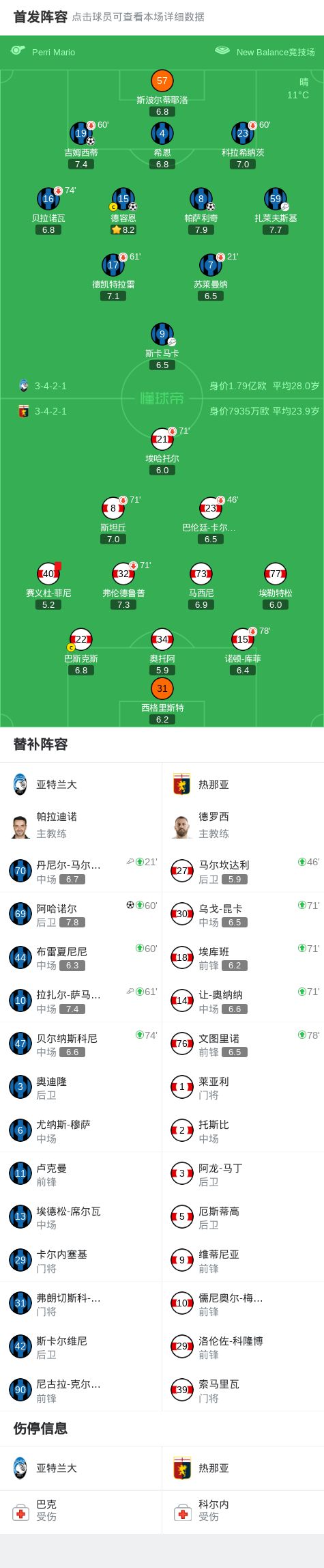第82分鐘,斯卡馬卡助攻帕薩利奇破門,亞特蘭大3-0熱那亞
