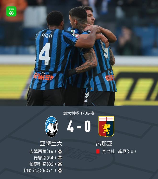 北京時間12月3日,意大利杯1/8決賽展開較量,亞特蘭大迎戰(zhàn)熱那亞。上半場扎萊夫斯基傳中,吉姆西蒂頭球破門,之后菲尼破壞貝拉諾瓦的單刀機會,裁判直接出示紅牌。下半場德容恩轟出一記世界波,之后斯卡馬卡助攻帕薩利奇破門,補時階段阿哈諾爾頭球破門。最終亞特蘭大4-0十人熱那亞晉級意杯8強。