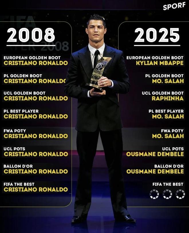 最近SPORF發(fā)布了“2008 vs 2025個(gè)人獎(jiǎng)項(xiàng)對(duì)照”。這張表最扎眼的矛盾很直接:2008這一列幾乎清一色都是C羅的名字,從金靴到年度最佳再到金球,基本一條線打穿;而2025這一列卻被拆成了幾個(gè)人各拿一塊,姆巴佩、薩拉赫、拉菲尼亞、登貝萊輪流上榜。同樣是頂級(jí)個(gè)人榮譽(yù),呈現(xiàn)出來的卻是“一個(gè)人橫掃”和“多人分?jǐn)偂眱煞N完全不同的畫面。