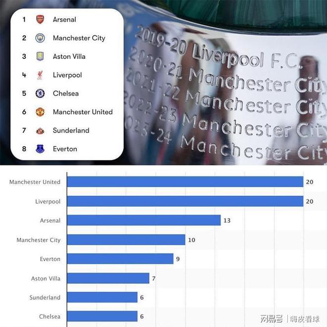 有統(tǒng)計(jì)表明,從1992賽季開(kāi)始,英超正式成立,包括此前的英甲,獲得頂級(jí)聯(lián)賽冠軍次數(shù)最多的,分別是曼聯(lián)和利物浦,都是20次奪冠。隨后是阿森納的13次,曼城的10次。不到10次的球隊(duì),還有埃弗頓(9次),阿斯頓維拉(7次),桑德蘭(6次)和切爾西(6次)。