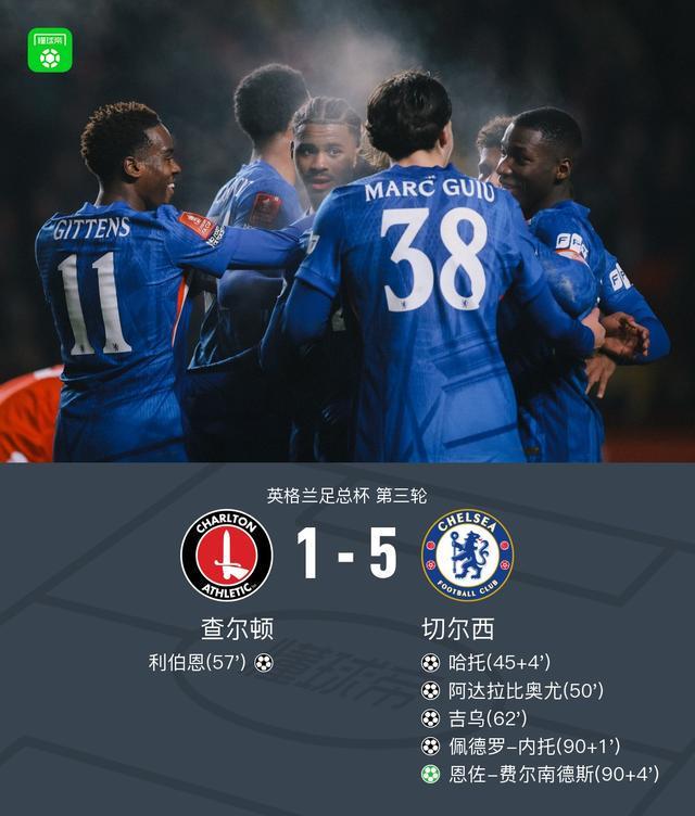 北京時間1月11日,英格蘭足總杯第三輪展開較量,查爾頓迎戰(zhàn)切爾西。上半場吉滕斯屢次遠射造險,哈托爆射破門,下半場阿達拉比奧尤頭球建功,利伯恩扳回一球,吉烏補射得分,內托內切低射破門,恩佐點射鎖定勝局。全場結束,查爾頓1-5不敵切爾西。