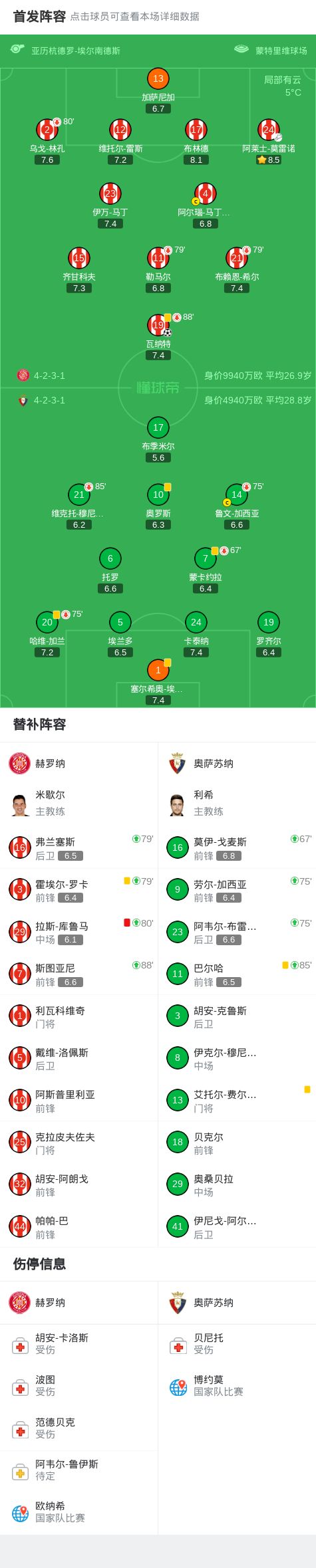 下半場補時第5分鐘,赫羅納球隊拉斯-庫魯馬吃到紅牌。