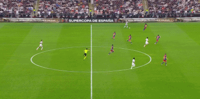 比賽開(kāi)打后,皇馬主動(dòng)放低姿態(tài)主打防守反擊,巴薩稍占主動(dòng);第25分鐘,拉菲尼亞接球勁射,庫(kù)爾圖瓦將球撲出;第32分鐘,巴爾德后場(chǎng)長(zhǎng)傳,佩德里左路高速前插橫傳,費(fèi)爾明撞射直接踢飛;1分鐘后,巴爾韋德回傳失誤,亞馬爾精準(zhǔn)長(zhǎng)傳到禁區(qū),拉菲尼亞不停球直接凌空打門(mén)沒(méi)吃準(zhǔn)部位踢偏。第36分鐘,費(fèi)爾明中圈斷球斜塞,拉菲尼亞迅速推進(jìn)一對(duì)一面對(duì)楚阿梅尼果斷低射遠(yuǎn)角得手,1:0!